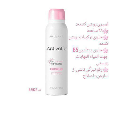 افرادی که فعالیت روزانه زیاد و یا روحیه ای پر جنب و جوش دارند، برای جلوگیری از ایجاد عرق و بوی نامطبوع، باید محصولاتی قوی و تخصصی استفاده کنند. از همین رو برند نام آشنای اوریفلیم، اسپری دئودورانت اوریفلیم سری اکتیول مدل Actiboost Fairness را تولید و به بازار عرضه نمود که ویژه این گونه افراد است. این محصول حاوی مواد معدنی بوده و تا 48 ساعت بدن را در مقابل عرق و بوهای نامطبوع ناشی از آن محافظت می کند. به لطف فناوری ActiBoost، کپسول های رایحه در لحظه حرکت فعال می شوند و با از بین بردن باکتری های سطح پوست، مانع ایجاد بوی بد بدن می شوند. علاوه بر این، از حفظ تعادل طبیعی رطوبت پوست برای طراوت در تمام طول روز برخوردار است. همچنین استفاده از اسپری دئودورانت اوریفلیم باعث شادابی و اعتماد به نفس شما میشود.